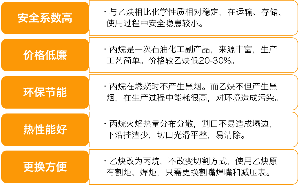 在切割焊接等工藝中,丙烷和乙炔都是常用的可燃氣體。然而在具體實踐中,丙烷因其安全、綠色、高效、性價比高等特點,逐漸成為工業(yè)用戶的首選氣體,大有取代乙炔之勢。與乙炔等氣體相比,丙烷具有多種優(yōu)勢: